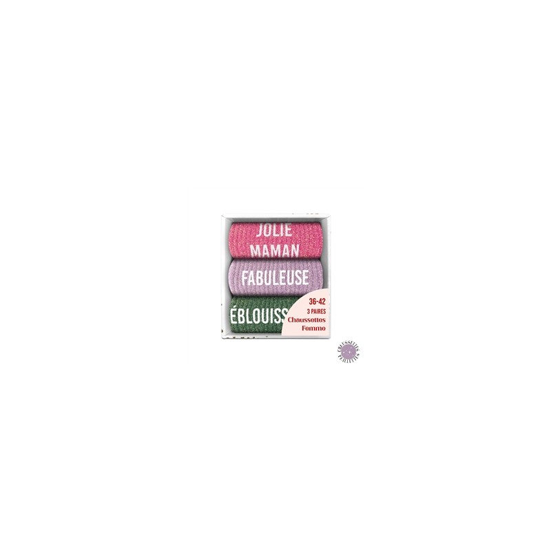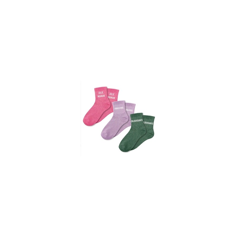 Confort garanti en portant ces 3 paires de chaussettes paillettes : l'une est rose avec la mention "Jolie Maman", une est mauve avec "Fabuleuse" et la dernière est verte avec "Éblouissante".