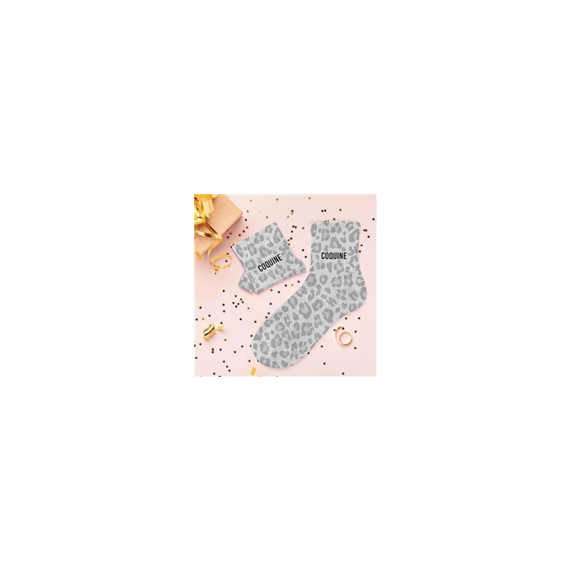 Ces chaussettes à paillettes argenté motif léopard ornées de la mention "coquine" en blanc sont la garantie d'un style scintillant, élégant en enveloppant vos pieds de douceur.