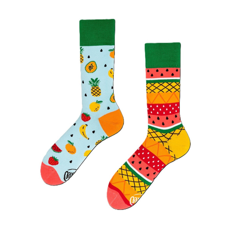 La banane, la pastèque et la papaye, c'est tout un tas de fruits ! Une orange, deux fraises et un ananas - tout ça pour vous ! Sur la vague du climat chaud de l'été, nous avons conçu un nouveau modèle de chaussettes dépareillées appelées Tutti Frutti - laissez-le vous accompagner sous les tropiques, dans les jardins familiaux, le matin et le soir - tout simplement, quelle que soit l'heure ! Et si vous vous souvenez encore du goût unique des chewing-gums Tutti Frutti, qui étaient l'essence de l'enfance, le nouveau modèle juteux de chaussettes longues pour filles et garçons vous le rappellera sûrement. Tous les fruits en même temps ? Oui, s'il vous plaît !