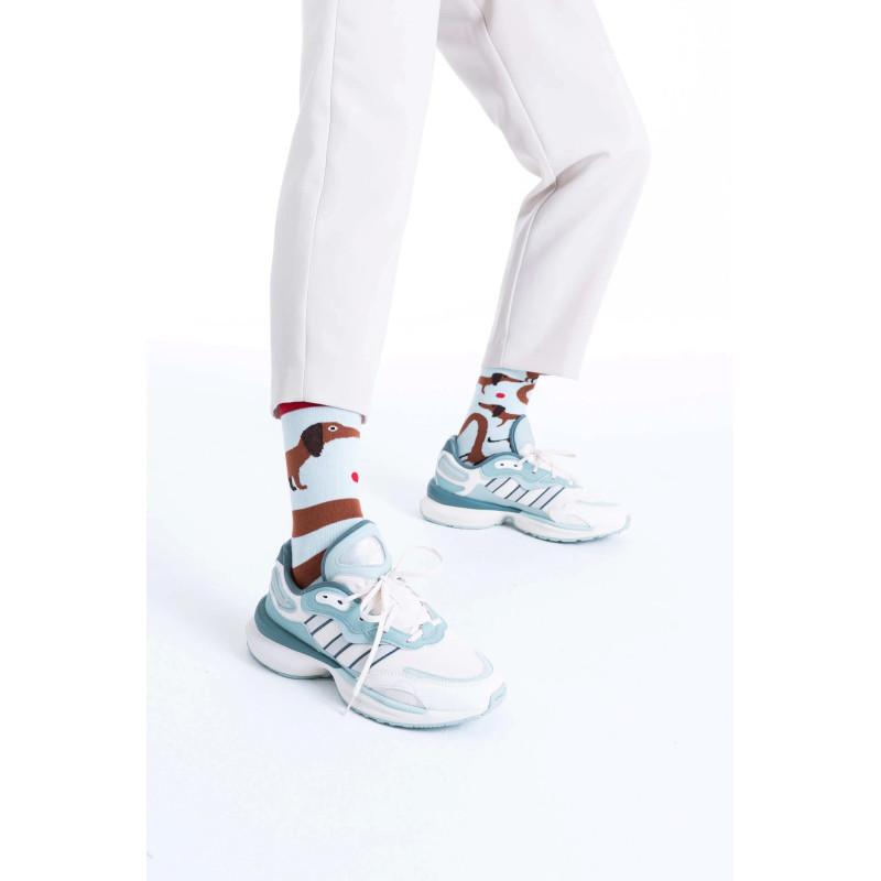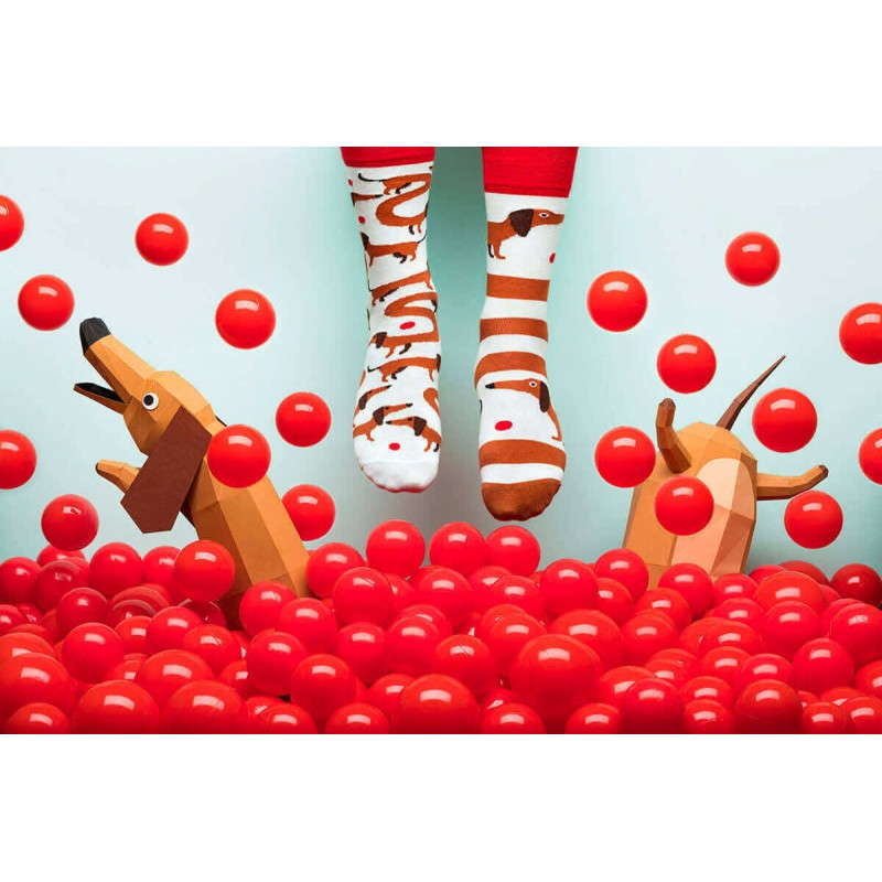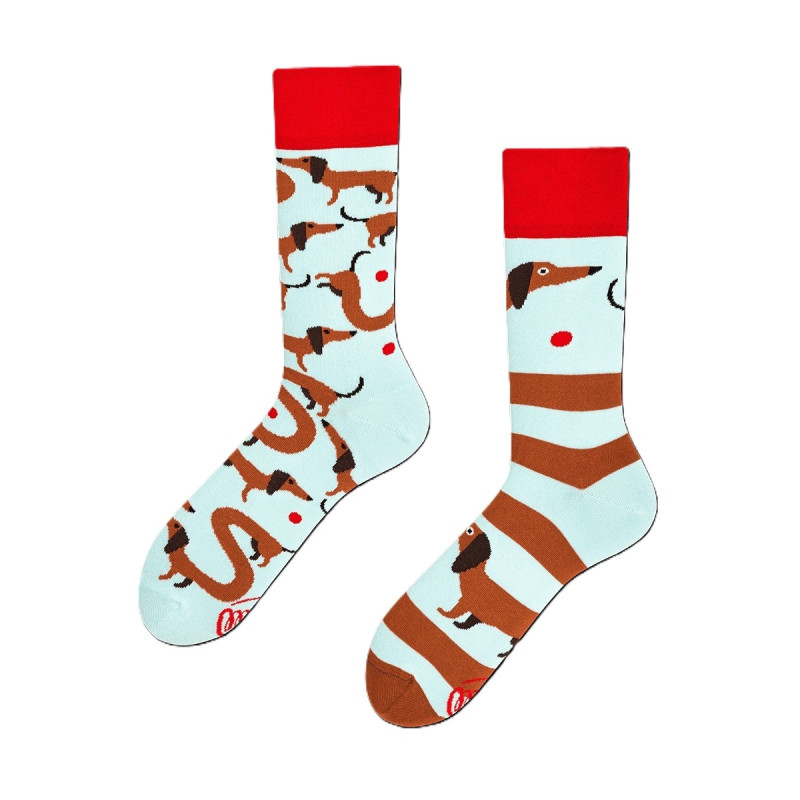 Des chaussettes rigolotes pour les créatures les plus longues et les plus furieuses que le monde ait connues. Oui - nous avons enfin créé un modèle avec des chiens-saucisse, qui d'une part entourent tout le pied, et d'autre part - fouillent autant qu'ils peuvent dans leurs courtes pattes ! Ces chaussettes sont destinées aux hommes et aux femmes qui n'ont pas peur des limites et qui avancent dans la vie avec audace. Exactement comme les chiens-saucisse, qui, quelle que soit leur corpulence, courent vite, aboient fort et ont toujours l'air charmants. Et c'est comme ça qu'on devrait vivre.