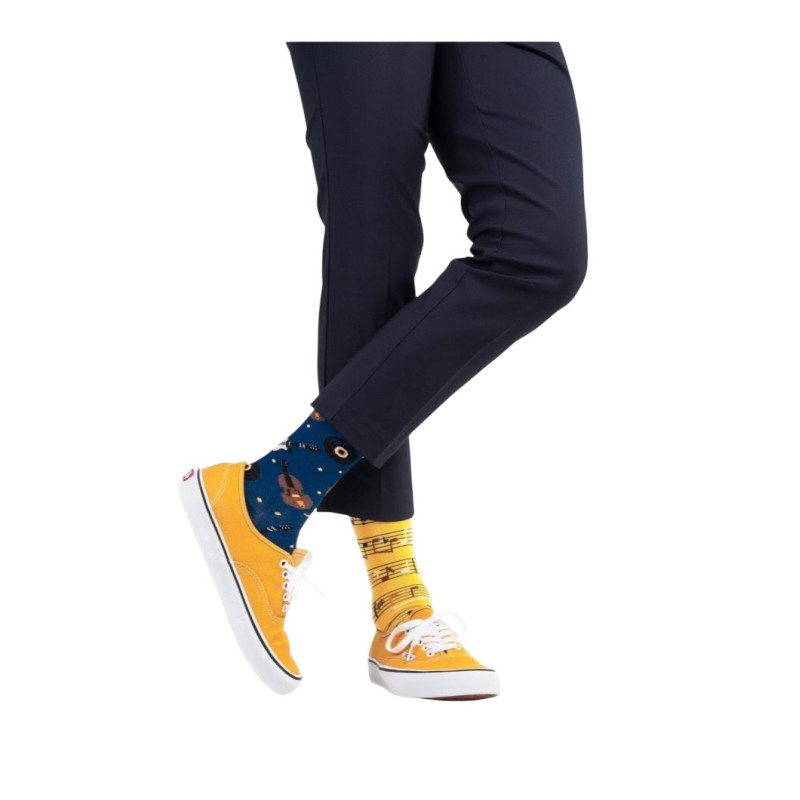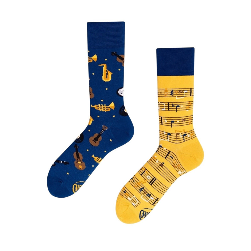 Trompettes et guitares s'associent. Des trombones, des mandolines - pour garçon et fille. Des flûtes et des tambours... faits du meilleur coton ? Oui ! Vous avez bien entendu ! Voici des chaussettes musicales, dont le caractère expressif et le design élégant sont reconnaissables dès la première note ! Nos nouvelles chaussettes dépareillées sont parfaites pour les musiciens professionnels ainsi que pour ceux qui ne chantent que sous la douche. Pour les dames et les messieurs. Pour les virtuoses et les fans de heavy metal. Et écoutons une citation d'un classique : « ... la musique est le meilleur remède - c'est comme une cinquième vitesse dans un long voyage » !