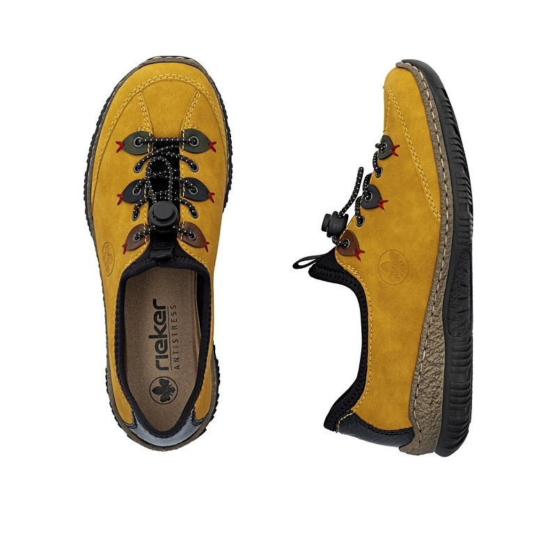 Cette chaussure à lacets élastiqués avec semelle légèrement compensé est à découvrir chez Rieker-webstore.fr.