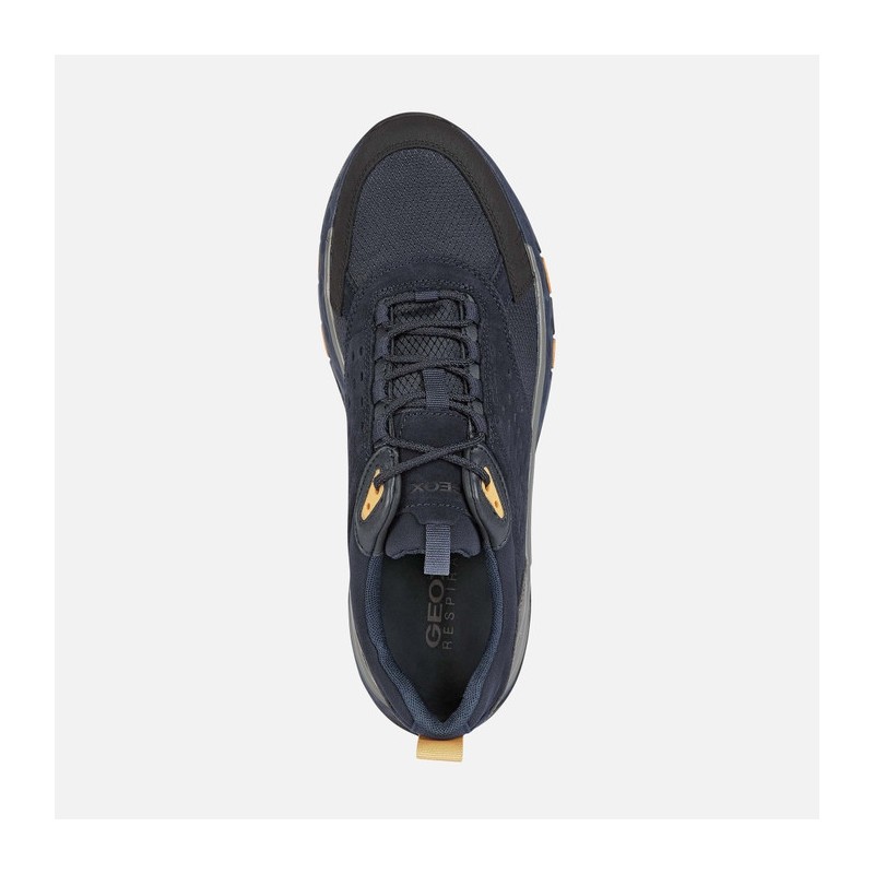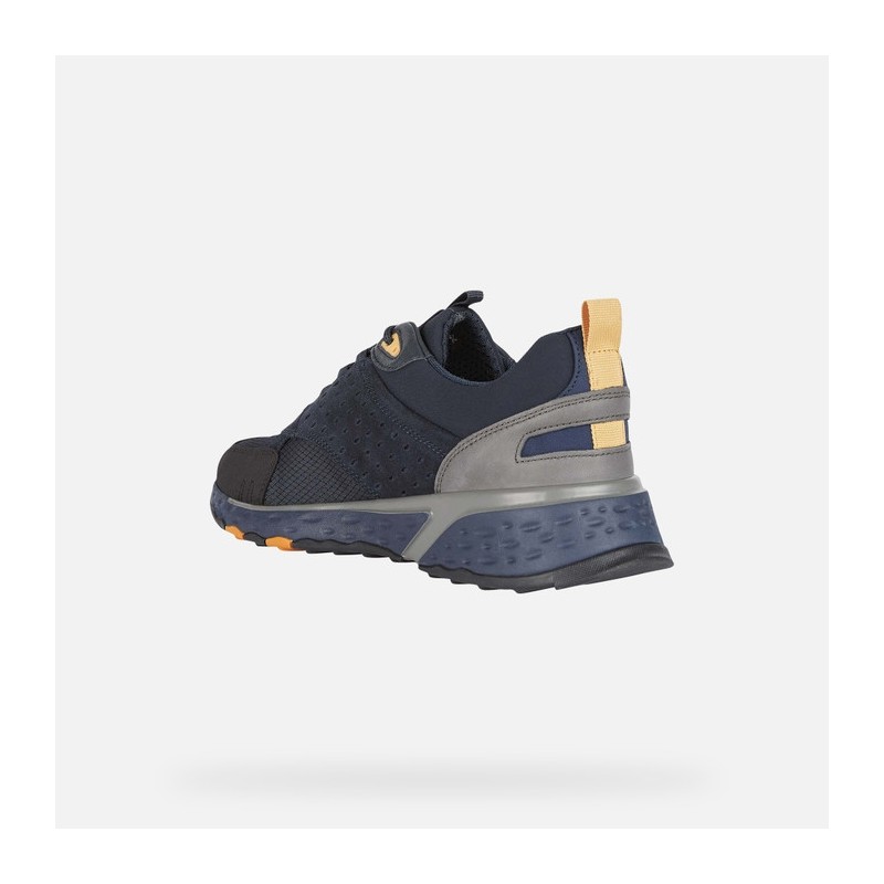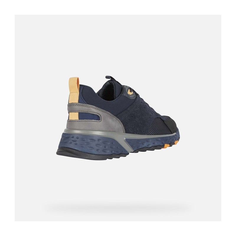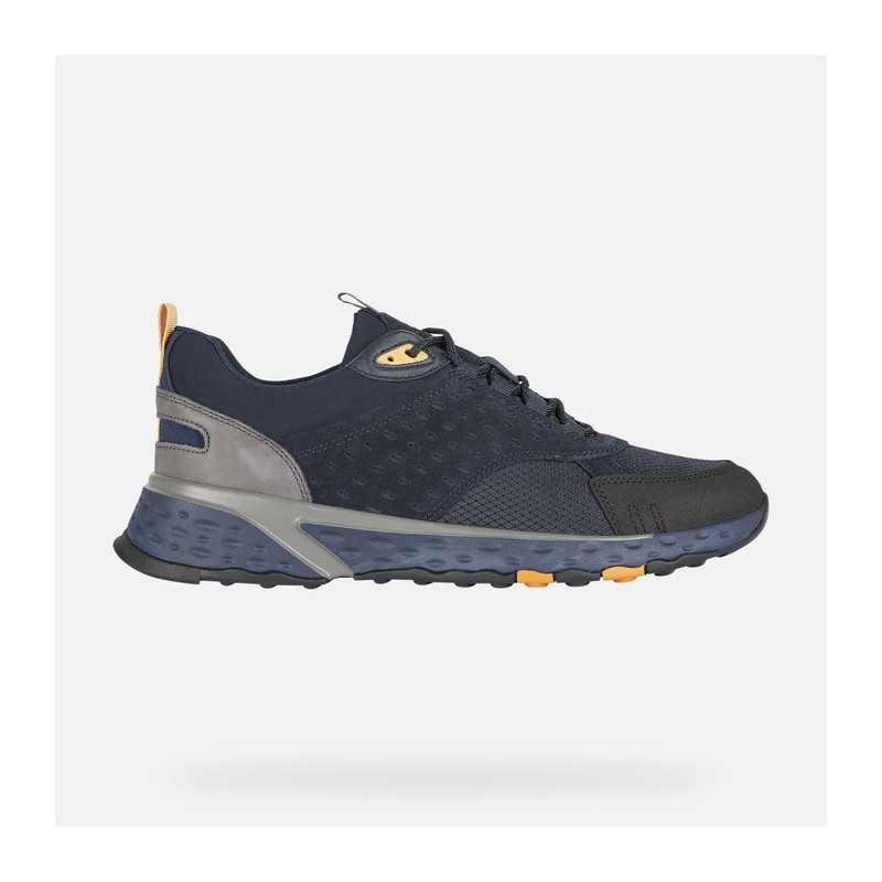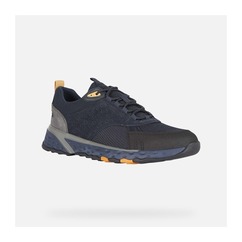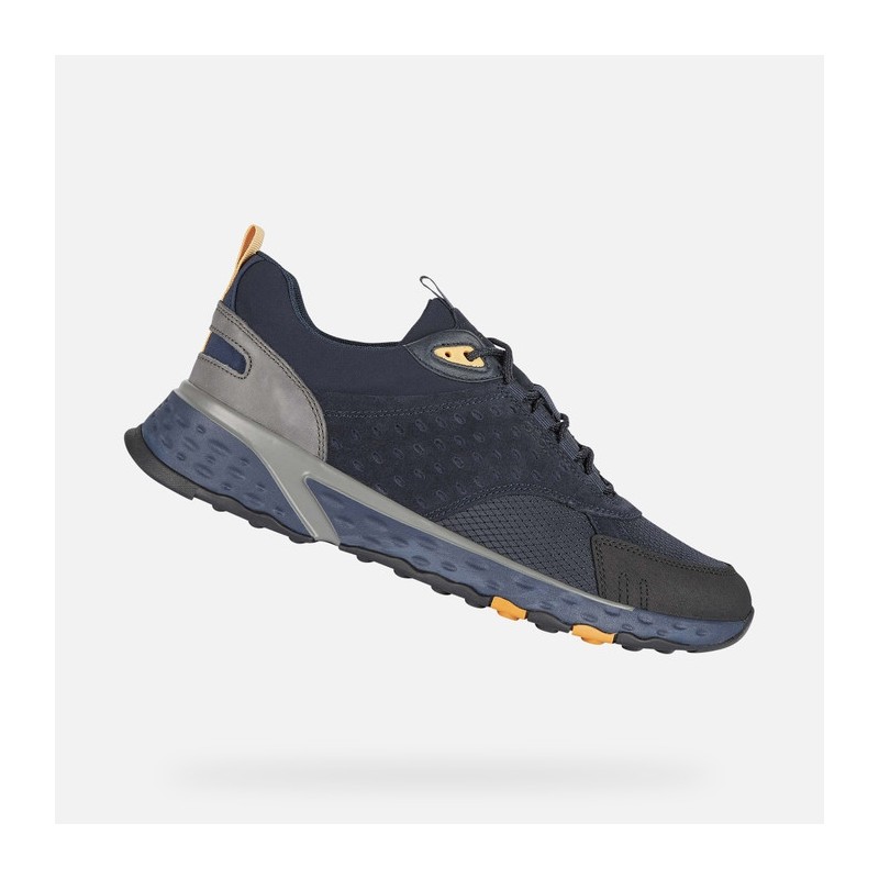 Pensées pour la vie citadine et les loisirs, les Sterrato mélangent cuir velours et tissu dans un coloris bleu marine.