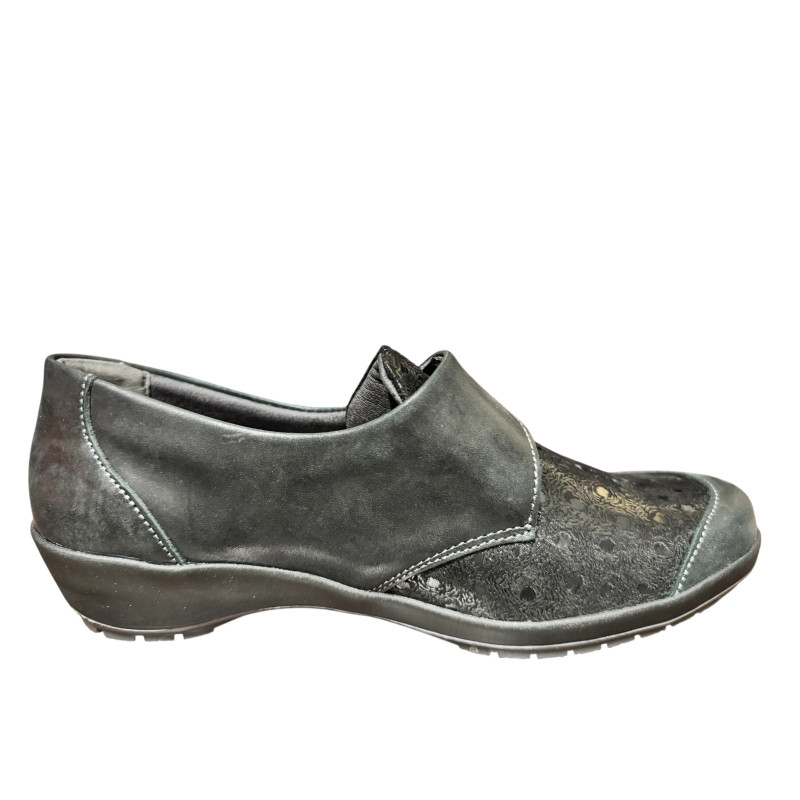 Cette chaussure classique Femme Suave 7142 mélange un cuir velouté noire avec une partie imprimée sur le dessus.
