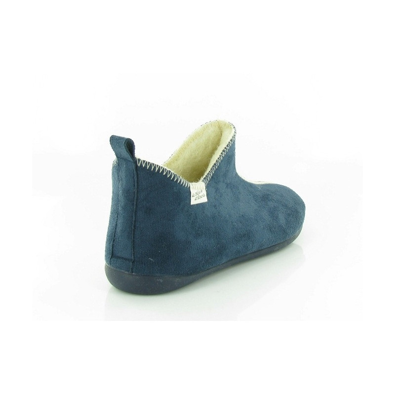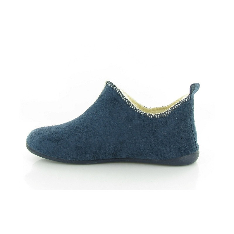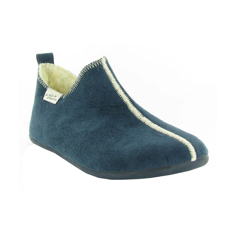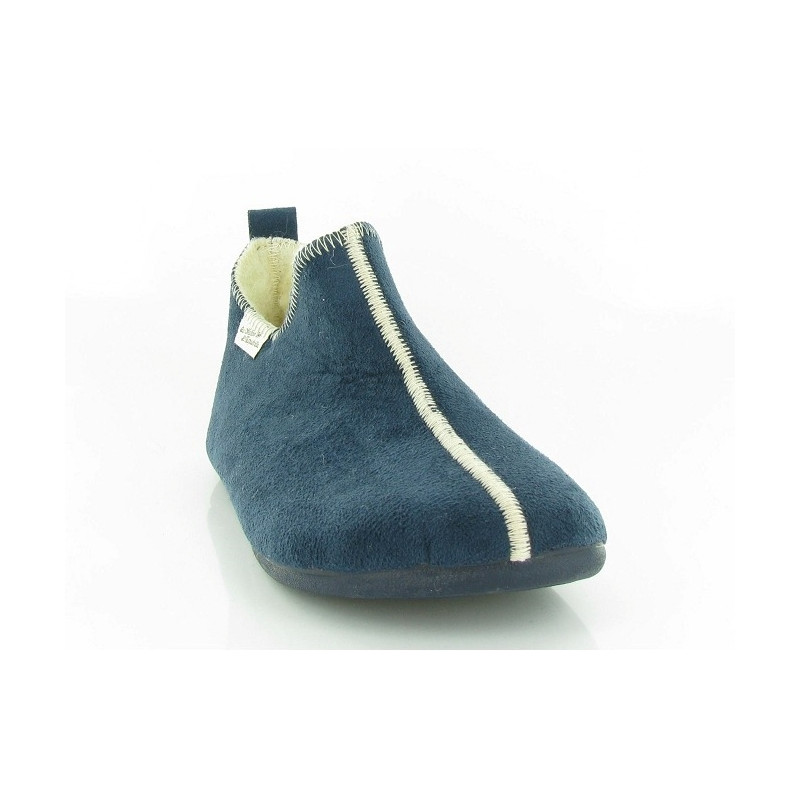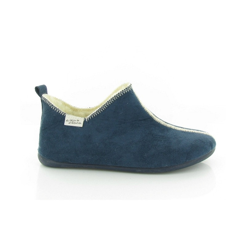 Cette panfoufle semi montante est en velours marine, ornée d'une couture contrastante sur le milieu.