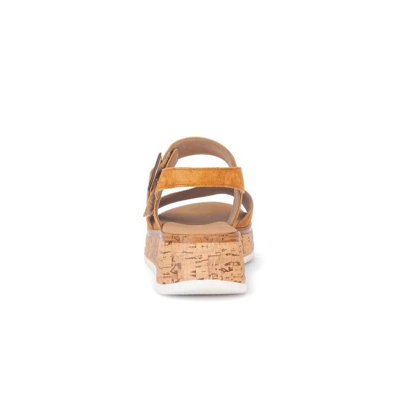 Sa teinte orangée et sa semelle effet liège en font un modèle tendance, idéal pour la saison estivale.
